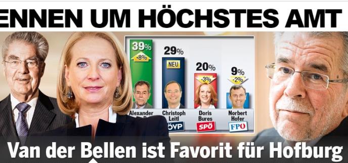 U trci za prvog čoveka države spominju se razni kandidati, a 39 odsto Austrijanaca volelo bi da vidi Aleksandera Van der Belena (Alexander Van der Bellen) iz stranke Zelenih na mestu prvog čoveka države.