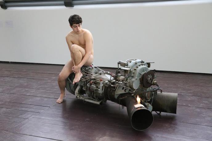 BEČ - U Paviljonu TBA21 u bečkom parku Augarten, otvorena je izložba "Retke zemlje" (Rare Earths). Sigurno da među mnogim delima jedno odmah zapadne za oko, radi se o provokativnoj instalaciji Rodžera Hiornsa (Velika Britanija). Na rashodovanom motoru helikoptera sedi potpuno nag mladić.