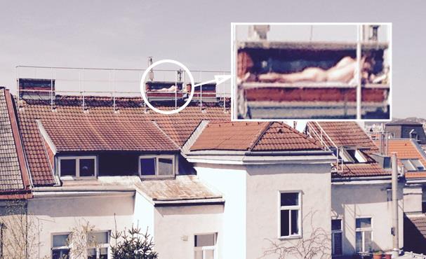 Ovaj mladić popeo se tamo gde se retko ko penje, osim dimničara, krovopokrivača i limara, na sam vrh krova kako bi osunčao svoje nago telo . Iako je mislio da će njegovo izležavanje na suncu biti neprimećeno oko susedove kamere je ovekovečilo ovaj neobični prizor.