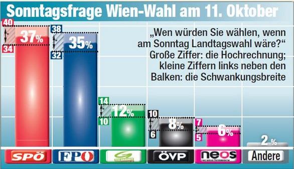 Prema tome, kako danas stoje stvari, socijaldemokrate mogu da dobiju od 34,1 do 40,9 odsto glasova, a slobodarci 30,2 do 36,8 odsto. Drugim rečima, nije nemoguće da FPÖ bude najjača partija na bečkim izborima 11. oktobra. Jedino što se čini zaista izvesnim je da će, u poređenju sa poslednjim bečkim izborima 2010. godine, socijaldemokrate izgubiti nekoliko procenata glasova, a slobodarci dobiti znatno veću podršku. Ostaje da se vidi koliko.