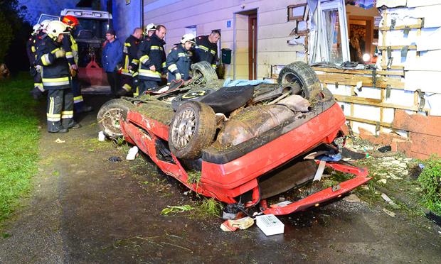 Automobil se bukvalno zakucao prednjim delom u zid kuće jednog poljoprivrednog imanja koje se nalazi uz drum. Od siline udarca popucao je zid kuhinje, a auto se posle udarca prevrnuo i završio na krovu.