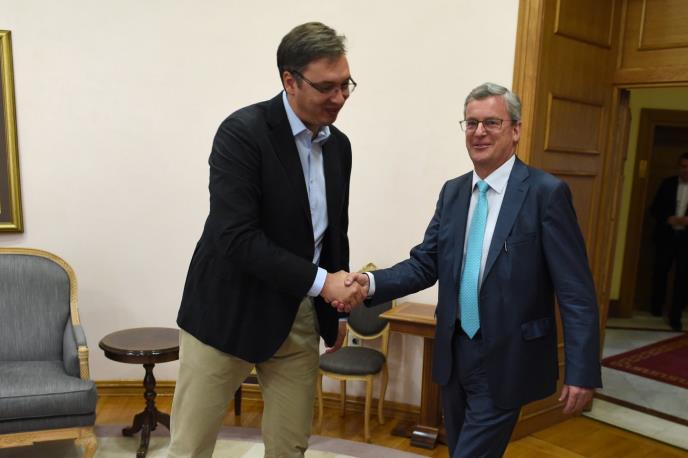BEOGRAD - Premijer Srbije Aleksandar Vučić sastao se sa ambasadorom Austrije u Beogradu Johanesom Ajgnerom, kome je zahvalio na svemu što Austrija čini u cilju podrške evropskom putu Srbije i na doprinosu u razvoju ekonomske saradnje