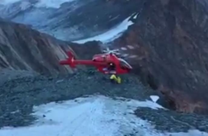 Na snimku se vidi helikopter koji se zarotirao u šrokom luku i zamalo ubio spasioca koji je par trenutaka ranije pomogao planinaru da se ukrca u letelicu.