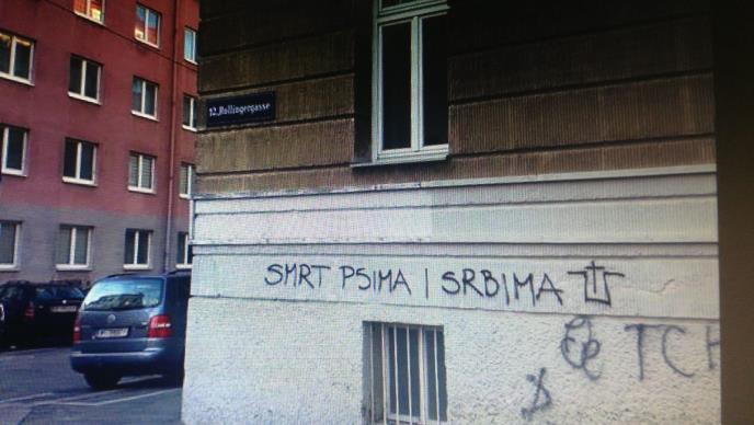 Početkom nedelje otkrivena su dva grafita u 12. bečkom okrugu, na dve zgrade udaljene na oko 50 metara, s porukom mržnje prema Srbima "Srbi na vrbe" uz ustaški simbol i "Smrt psima i Srbima".