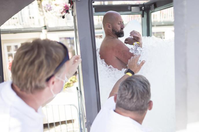 Više od 200 kilograma kockica leda bilo je potrebno da se napuni do Korbelovih ramena stakleni boks u kome je stajao samo sa kupaćim gaćama na sebi.