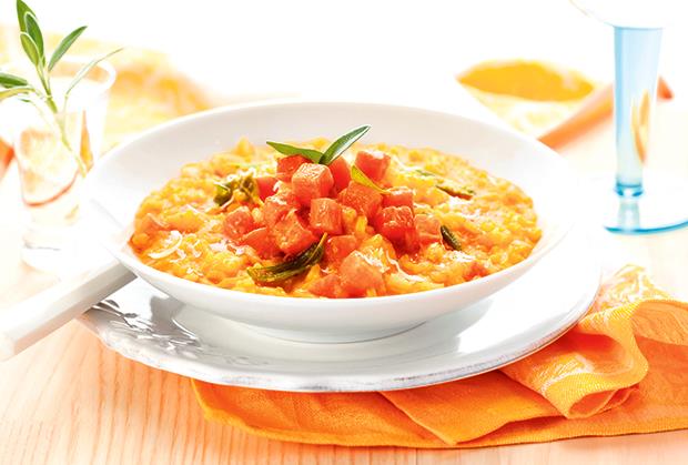 Dok se bundeva peče, pripremite rižoto. Iseckajte crni luk i izdinstajte ga na ulju i puteru na umerenoj temperaturi. Dodajte usitnjen beli kuk. Kad omekša, dodajte kim i pirinač. Dobro promešajte i kuvajte oko minut. Sipajte pola šolje supe i povremeno mešajte dok pirinač ne upije tečnost, pa postepeno dodajte i ostatak supe i kuvajte dok pirinač ne omekša. Kad je kuvan, dodajte pečenu bundevu i rendani parmezan, iseckan korijander i ukrasite peršunom.