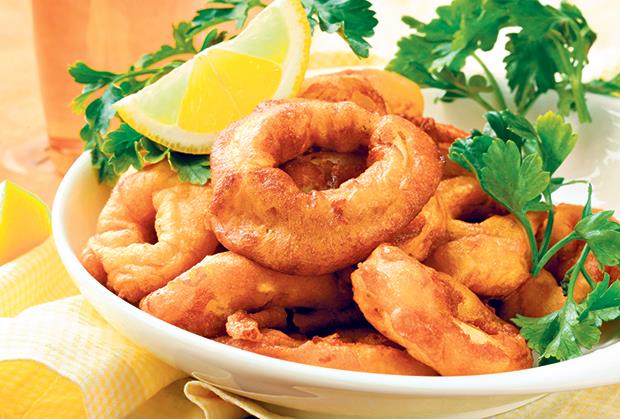 Isečene lignje umočite u smesu i pržite ih u vrućem ulju tri do četiri minute, dok ne postanu hrskave i zlatne. Ocedite ih na papirnom ubrusu i poslužite uz prilog po želji.