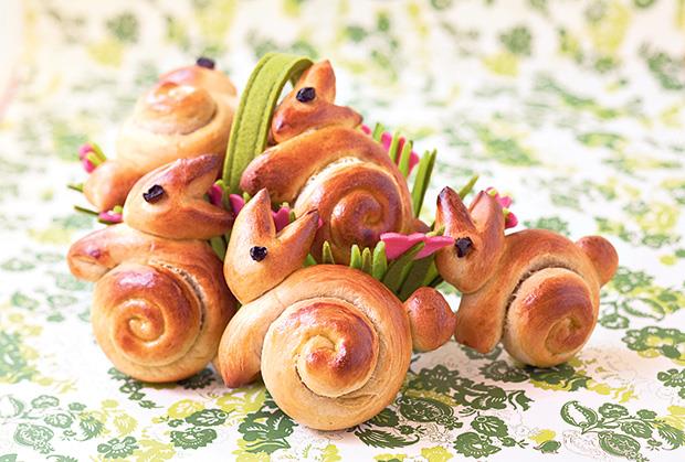 Kvasac izmrvite u toplom mleku sa kašičicom šećera i ostavite da nadođe. Suve sastojke promešajte, u sredinu stavite jaje i žumanca, pa mikserom sa spiralnim dodacima umesite testo uz postepeno dodavanje maslaca i nadošlog kvasca. Testo prebacite na radnu površinu, pa ga mesite rukama dok ne postane kompaktno. Pokrijte ga folijom i pustite da se diže 40 minuta, pa ga potom premesite i podelite u osam delova. Od svakog dela napravite valjak, od njega otkinite dva dela - jedan koji ćete zaseći nožem da dobijete glavu i uši, a od drugog, koji će biti repić, formirajte kuglicu. Najveći deo valjka zarolajte u spiralu i kao na slici postavite glavu i rep, pa ih rukama malo fiksirajte da budu u komadu. Suvo grožđe stavite na mesto očiju, ostavite testo da još malo naraste, pa zeke premažite umućenim jajetom i pecite u zagrejanoj rerni na 180 stepeni.