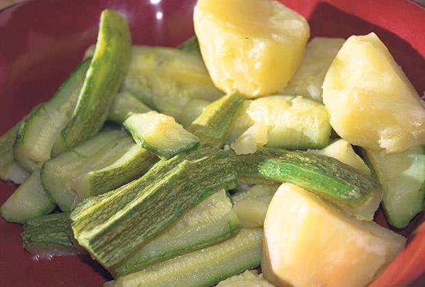 1. U slanu vodu stavite krompir isečen na kockice da prokuva. Posle pet minuta dodajte tikvice.