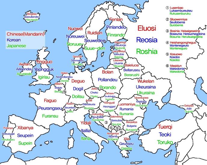 Jedan od korisnika društvene mreže Redit objavio je mapu Evrope na kojoj su uobičajeni nazivi država zamenjeni onima kako ih izgovaraju u Kini, Koreji i Japanu.