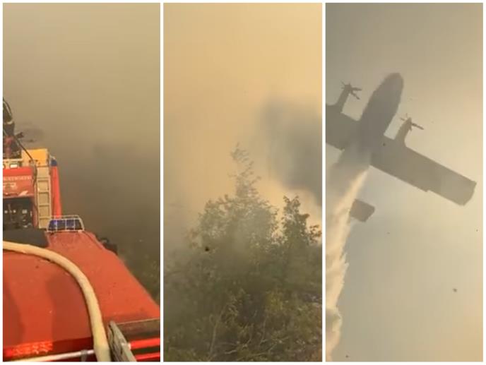 Odjednom se iznad njih pojavljuje kanader koji izbacuje veliku količinu vode. "Spasao nas je", rekao je autor snimka, dok se u pozadini čuju uzvici uzbuđenja.