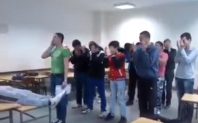 Dok jedan od učenika leži na stolu izigravajući umrlog, ostali “klanjaju dženazu” a u jednom trenutku se vidi i kako se jedan od učenika krsti i klanja do poda.