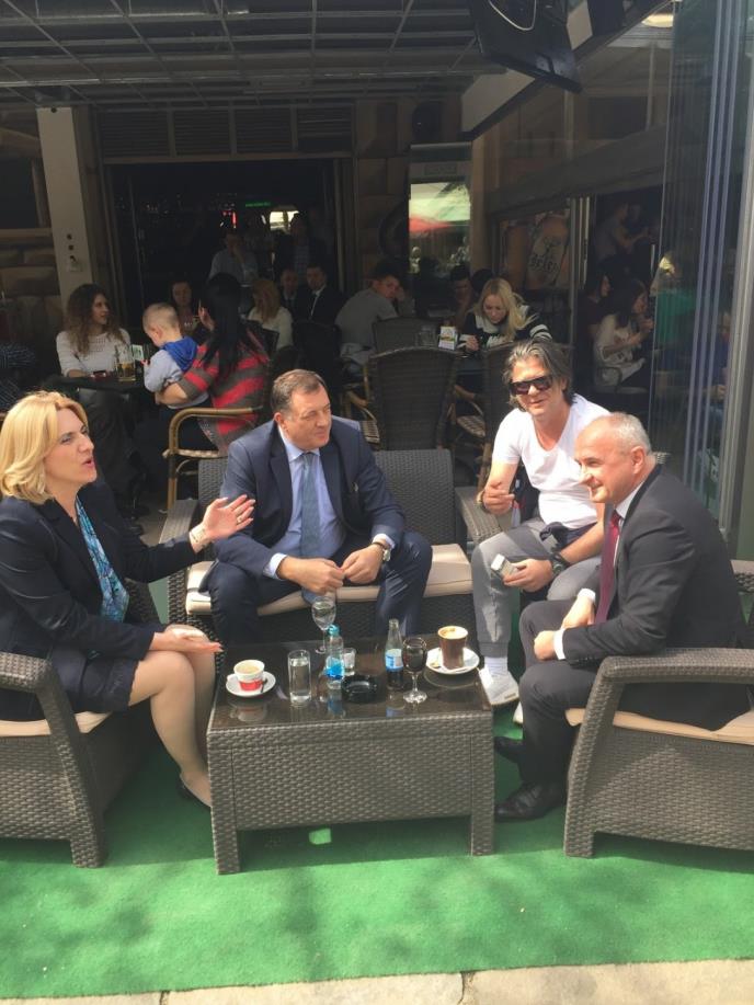 U bašti kafića, danas oko 14:30, Dodik je sedeo sa predsednicom Vlade Željkom Cvijanović, liderom Socijalističke partije Petrom Đokićem i banjalučkim novinarom i blogerom Slobodana Vaskovića