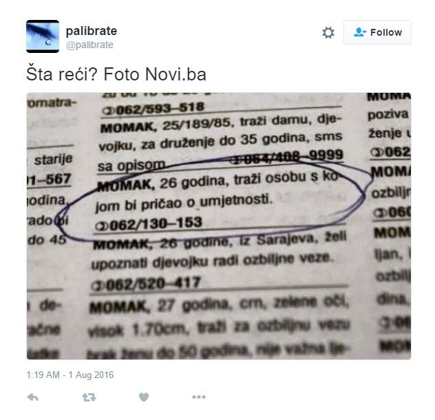 Oglas 26-godišnjeg momka, najverovatnije iz Sarajeva, koji traži devojku sa kojom bi pričao o umetnosti, rastužio je mnoge.