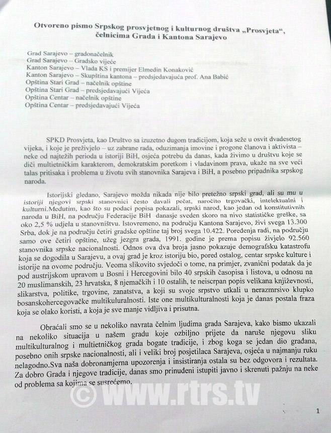 SARAJEVO - Rukovodstvo Srpskog prosvetnog i kulturnog društva "Prosvjeta" uputilo je danas otvoreno pismo o položaju srpskog naroda u Sarajevu i Federaciji BiH.