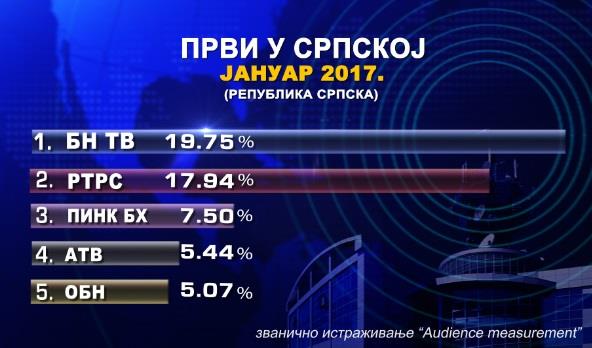 Podsećamo, Dnevnik 2 BN TV bio je najgledaniji i u celoj 2016. godini.Što se tiče cele BiH, nakon OBN i FTV gotovo podednako su bili gledani BN TV i RTRS sa skoro ujednačenim šerom, koji je ovaj put za BH publiku bio 0,02 % u korist RTRS-a