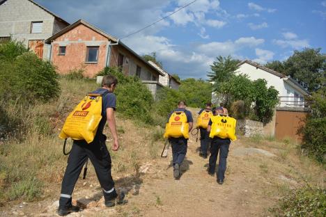 Teren je nepristupačan, zbog čega vatrogasci vatru gase naprtnjačama, a u ovoj misiji pomaže im i lokalno stanovništvo, koje nosi vodu.