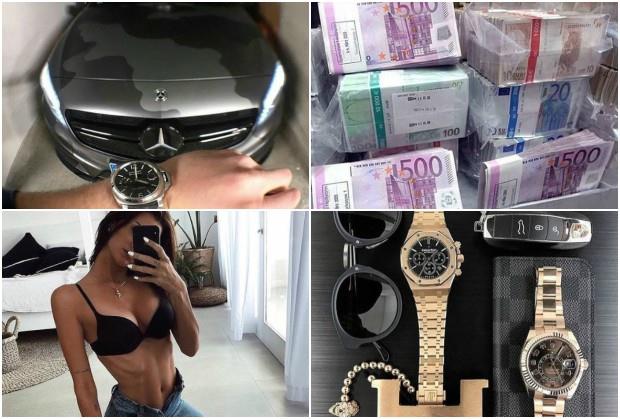Tu su skupocena kola, razmetanje novcem, satovima i telefonima, kao i pregršt fotografija devojaka u izazovnim pozama.