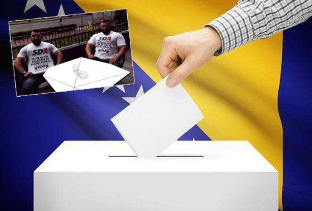 Najnovija u nizu je fotografija dvojice mišićavih muškaraca odevenih u majice sa natpisom "SDA - KO NE GLASA DOLAZIMO NA KUĆNU ADRESU".