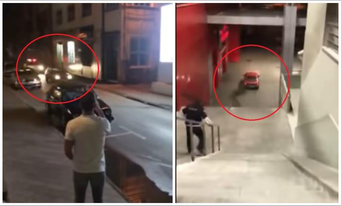 Nakon što su policajci shvatili šta je begunac učinio, jedan od policijaca je izašao iz automobila i otrčao niz stepenice.