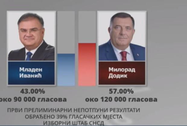 Portparol SNSD Radovan Kovačević je najavio dolazak kandidata za srpskog člana Predsedništva BiH Milorada Dodika u izborni štab u Banjaluci. Na 39 odsto obrađenih biračkih mesta predsednik Milorad Dodik je osvojio 57 odsto glasova a Mladen Ivanić 43. Predsednik Dodik već je osvojio 120 hiljada glasova, a Ivanić 90.000.