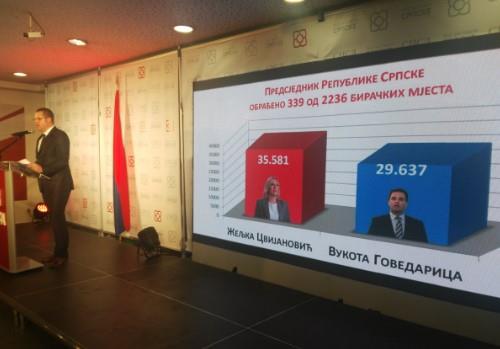 Kada je reč o kandidatima za predsednika Republike Srpske, Kovačević je saopštio da je Željka Cvijanović kandidat SNSD za mesto predsednika Republike Srpske na osnovu 34,97 odsto obrađenih biračkih mesta, osvojila 96.201 glasova.