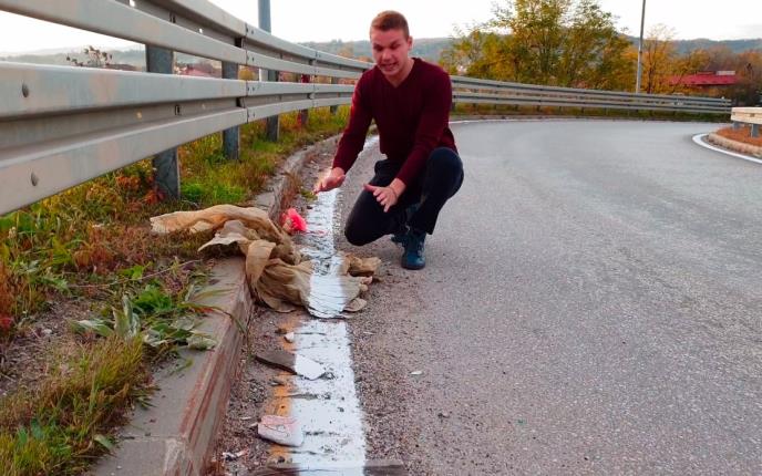 Na društvenim mrežama se pojavio video u kome se vidi kako su izvođači radova na obnovi horizontalne saobraćajne signalizacije na putu Banjaluka-Prnjavor prefarbali najlonsku kesu umesto asfalta.