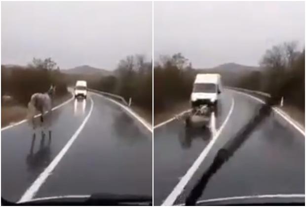 Kolovoz je bio mokar, a onda je konj u jednom trenutku pao. Baš tada se iz suprotne trake pojavio kombi i malo je falilo da udari životinju.