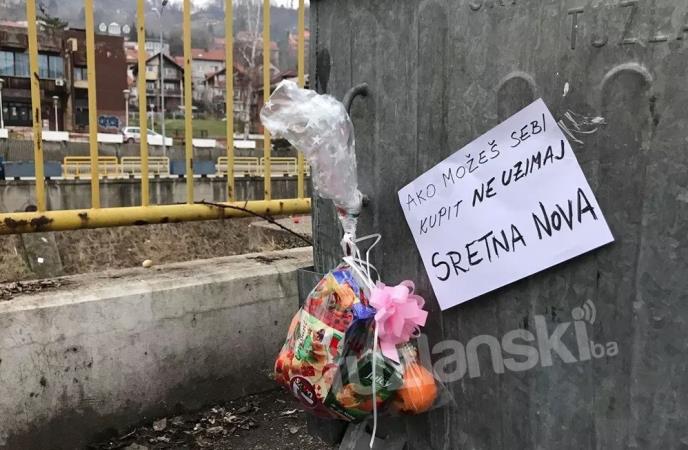 Novogodišnji paketić obešen na kontejneru za smeće, uz ispisanu poruku: