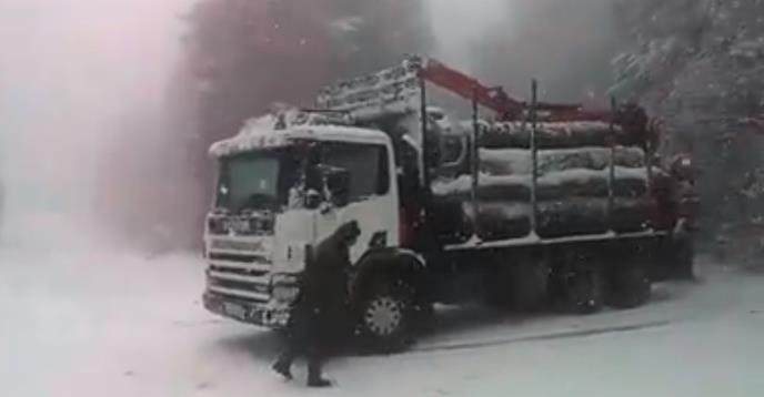 Na internetu se pojavio snimak na kom se vidi jedan vozač kamiona koji je stoji u snežnom nanosu dok ga drugi snima.