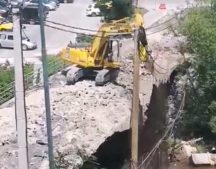 Građevinci bagerom komade betona istresaju u Miljacku koja protiče ispod mosta, umesto da ovaj otpad odvoze na za to predviđena odlagališta građevinskog materijala.