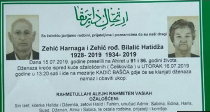 "Jutros u pola pet sam ušao u sobu i video oca mrtvog. Po tome kako je izgledao, bilo je to neposredno nakon što je izdahnuo. Majka je bila u kupatilu, a kad smo je, s obzirom na to da je bila nepokretna, uneli u sobu, njoj je odjednom bilo loše i ona se za nekih desetak minuta rastavila s dušom. Ovo jeste čudna sudbina, ali, s obzirom na to da su proveli 67 godina skladnog braka, zajedno delili i dobro i zlo, možda i nije čudno", rekao je Izet Zehić, sin Harnage i Hatidže.