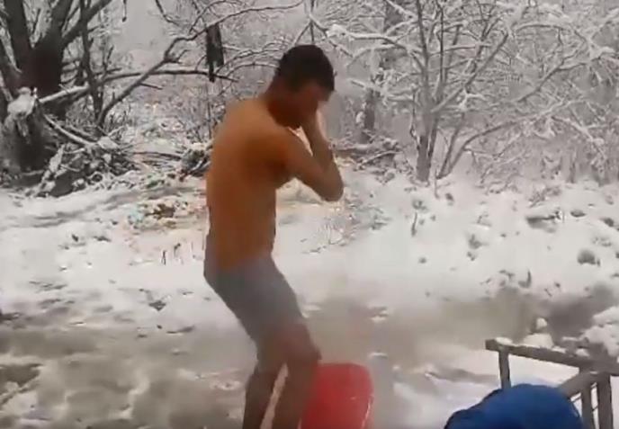 Ono što je posebno privuklo pažnju na društvenim mrežama jeste snimak migranta koji se kupa na snegu. Stoji u donjem vešu na hladnoći i poliva se vodom iz kante.
