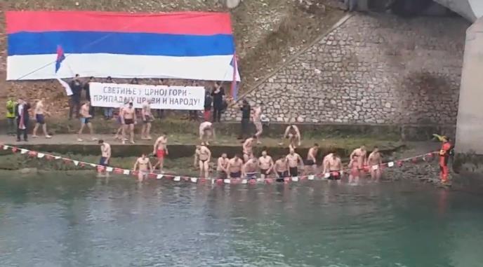 Uz povike "Ne damo svetinje" u Banjaluci je danas, na Bogojavljenje, nakon litije za podršku braći u Crnoj Gori, 33 plivača zaplivalo za časni krst.