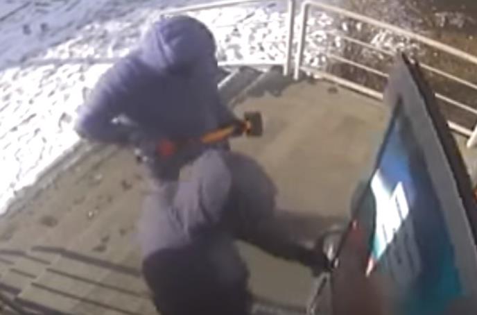 Na snimku s nadzornih kamera vidi se kako dvojica muškaraca s kapuljačama na glavi dolaze do vrata i macolom razbijaju staklo.