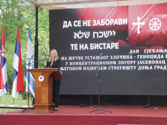 "Zahvalnost Srbiji što i danas, zajedno, obeležavamo ovaj dan", rekla je Cvijanović na obeležavanju Dana sećanja na žrtve ustaškog zločina - genocida u koncentracionom logoru Jasenovac i njegovom najvećem stratištu Donjoj Gradini, prenosi RTRS.