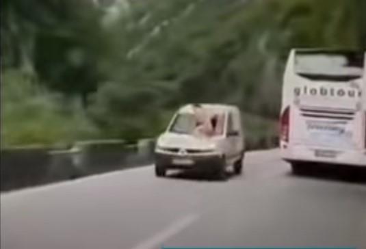 Navodno je ljubavna rasprava bila okidač da akteri ovog neobičnog događaja završe na internetu, gde danima kruži snimak na kojoj se vidi kako na haubi vozila u pokretu sedi poluluodevena devojka.