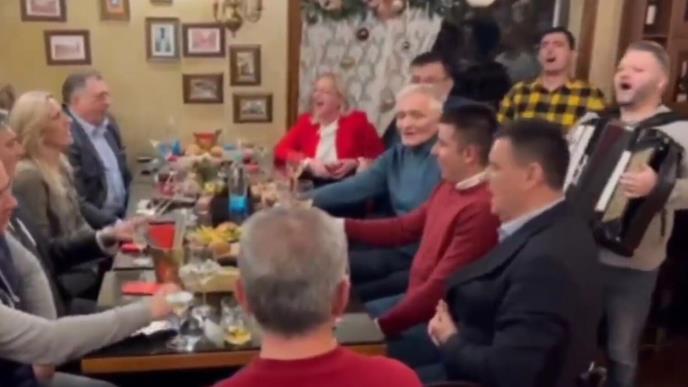 Srpski član Predsedništva BiH Milorad Dodik sa najbližim saradnicima obeležio je uvođenje američkih sankcija njemu i banjalučkoj Alternativnoj televiziji i sa saradnicima zapevao pesmu "Ali metar našeg sela, Amerika cela".