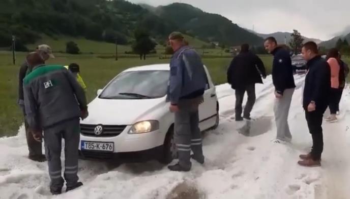 Kako se vidi, u Gornjem Vakufu je padao jak grad koji je zabelio ulice. Neki automobili su se čak zaglavili na putu kao da je decembar.