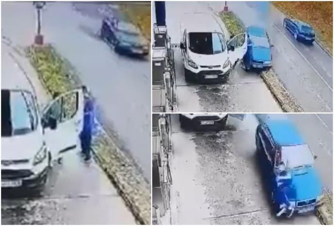 Verovatno da izbegne mogući sudar s automobilom iz suprotne trake, osoba je naglo skrenula i udarila u radnika i u vrata od kedija koji je bio parkiran kod vozača.