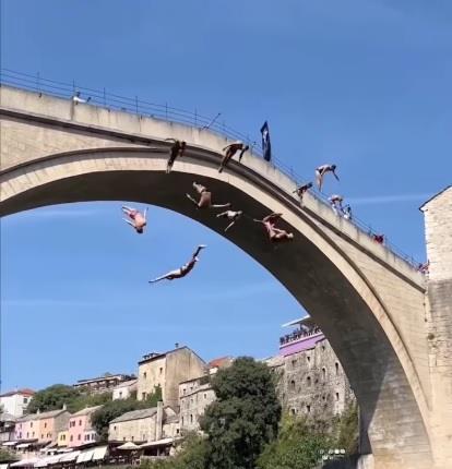 Tako je bilo i nedavno kada je grupa profesionalaca koji se bavi takozvanim visokim ronjenjem ili ronjenjem sa litice (cliff diving), izvela možda i najspektakularniji i najopasniji skok sa mostarskog Starog mosta.