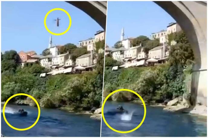 U trenutku kad se pred okupljenom publikom mostarski skakač vinuo u Neretvu, pojavio se čamac koji je prolazio ispod luka Starog mosta.