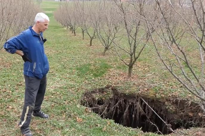 Mirsada Zuluma, koji radi na održavanju plantaže lešnika, nadomak Gornjeg Vakufa - Uskoplja pre nekoliko dana potpuno je zatekla velika jama koja se pojavila među drvećem.