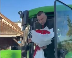 Kada je izašao iz kabine traktora, u ruci je nosio veliki buket crvenih ruža.