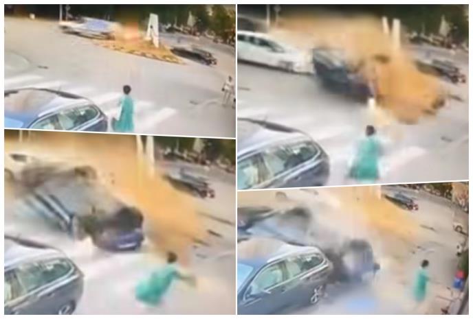 Sudar je bio toliko jak da su kombi i automobil završili prevrnuti, a jedno od vozila se okrenulo na krov i klizilo nadomak pešakinje.