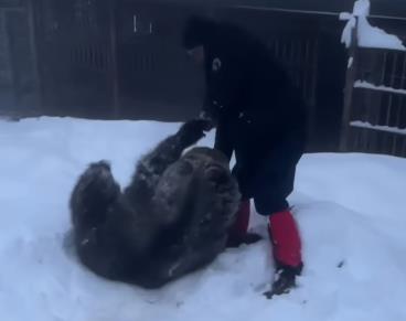 NEVEROVATNE SCENE IZ DOBOJA: Maša se izležava i sprema za zimski san, ali zato Ljubica ne miruje! Onolika zver a igra se u snegu kao meče (VIDEO)