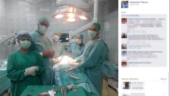 PODGORICA - Hirurg zaposlen u Kliničkom centru Crne Gore Aleksandar Filipović objavio je na svom Facebook profilu fotografiju iz operacione sale, na kojoj se, kako se čini, vidi pokriveni pacijent i pet članova medicinskog tima. Jedan od članova medicinskog tima je i dr Filipović koji na rukama nema sterilne rukavice, piše "Dan." Fotografija je nastala nakon ili tokom hirurške intervencije u operacionoj sali, jer se na stolu vidi okrvavljena vata.