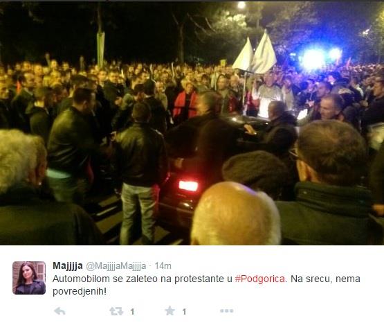 Večerašnji protesti u Podgorici gde se okupilo više hiljada ljudi kako bi zahtevalo ostavku vlade Mila Đukanovića protiču uglavnom bez incidenata, ali se među okupljenima i jedan automobil koji je hteo da rastera demonstrante tako što je kolima uleteo u masu.