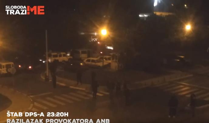"Pripadnici specijalnih batinaških i provokatorskih jedinica ANB na snimku u patikama i trenerkama sa kapuljačama nakon što su istovareni iz policijskih džipova ispred štaba UDBE (sedište DPS, stara zgrada Vlade), razilaze se nakon uspešno odrađenog posla odmah nakon izazvanih nereda i razbijenih mirnih protesta DF-a. Sati je 23:20 Subota, 24. oktobar 2015.", navodi se na stranici "Sloboda traži ljude".