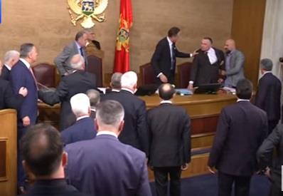 Tuču su sprečili poslanici i skupštinsko obezbeđenje. Sednica Skupštine Crne Gore samo što je počela je i završena pošto su poslanici Demokratskog fronta izlazak premijera Mila Đukanovića za govornicu dočekali skandiranjem "Milo, lopove" iz svojih poslaničkih klupa.